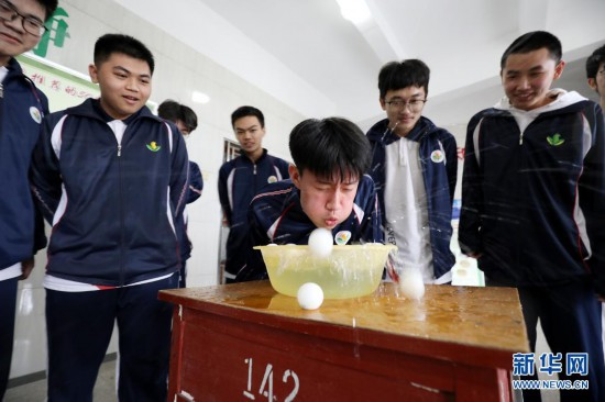 5月18日,湖南省資興市立中學的高三學生在進行乒乓球趣味游戲。