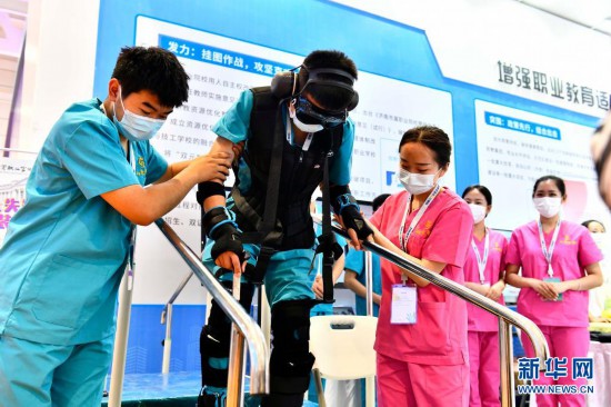 5月20日,在山東國際會展中心,山東圣翰財貿職業學院學生通過智能設備體驗失能老人生活。