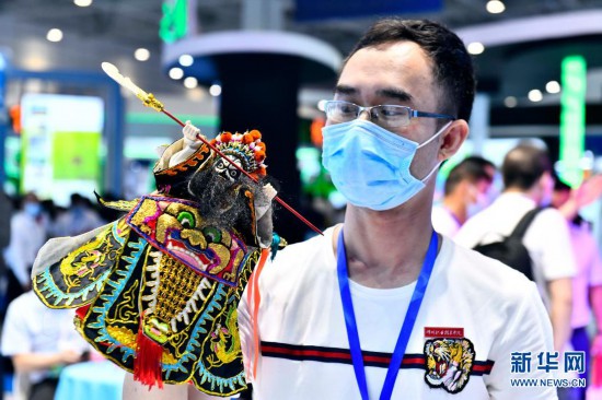 5月20日,在山東國際會展中心,漳州職業技術學院參會代表展示木偶戲技能。