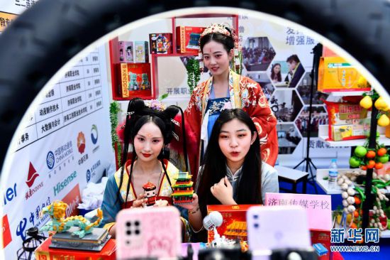 5月20日,在山東國際會展中心,濟南傳媒學校學生展示“直播帶貨”。