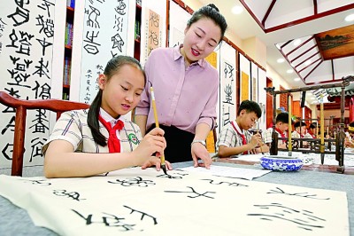 5月26日,在山東省棗莊市市中區建設路小學“甲骨文教室”,甲骨文專業教師呂欣(左二)在指導學生學習甲骨文書法。近年來,山東省棗莊市市中區建設路小學把甲骨文文化作為校本課程引進校園,定期或不定期邀請甲骨文專家走進課堂向學生傳授甲骨文知識,并開展豐富多彩的“書寫甲骨文百米長卷”“甲骨文楹聯比賽”等活動,探索漢字的起源與演變,全面普及甲骨文文化,讓學生從中感受甲骨文文化的魅力。(孫中喆)