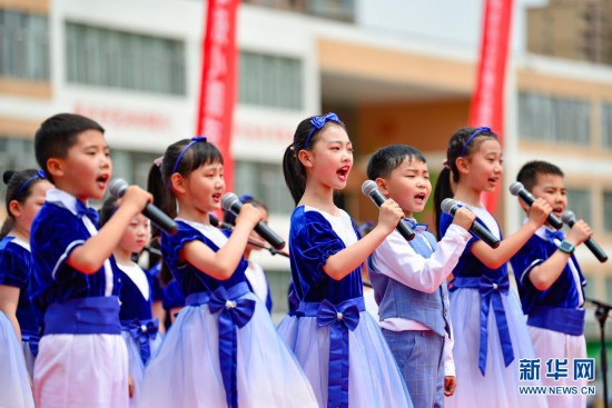 5月31日,在呼和浩特市賽罕區敕勒川綠地小學騰飛路校區,合唱社團學生在音樂節上演唱歌曲。