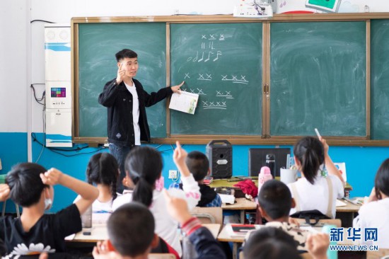 在黑龍江省安達市任民鎮中心小學,音樂老師李平在教室里上音樂課(5月25日攝)。