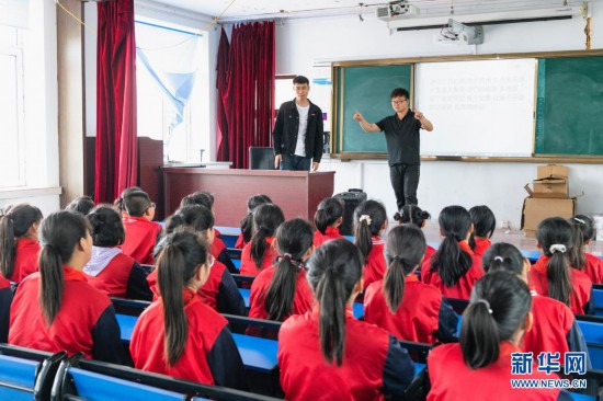 在黑龍江省安達市任民鎮中心小學,李平(后左)和張雨在指導“村里的孩兒”音樂班的孩子練習合唱(5月25日攝)。