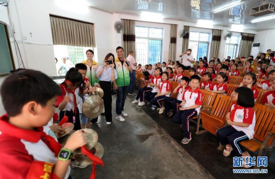 6月3日,資興市鯉魚江完全小學學生在體驗使用花鼓戲表演所需的伴奏樂器。