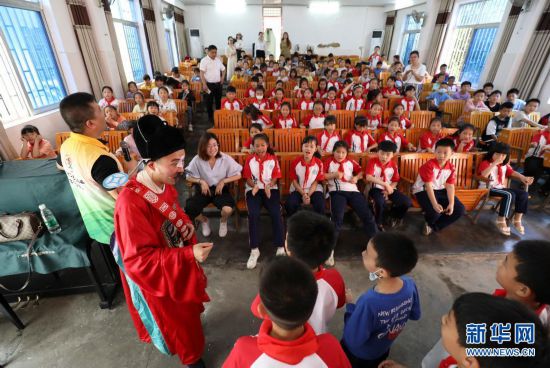 6月3日,在資興市鯉魚江完全小學,演員指導學生學習花鼓戲。