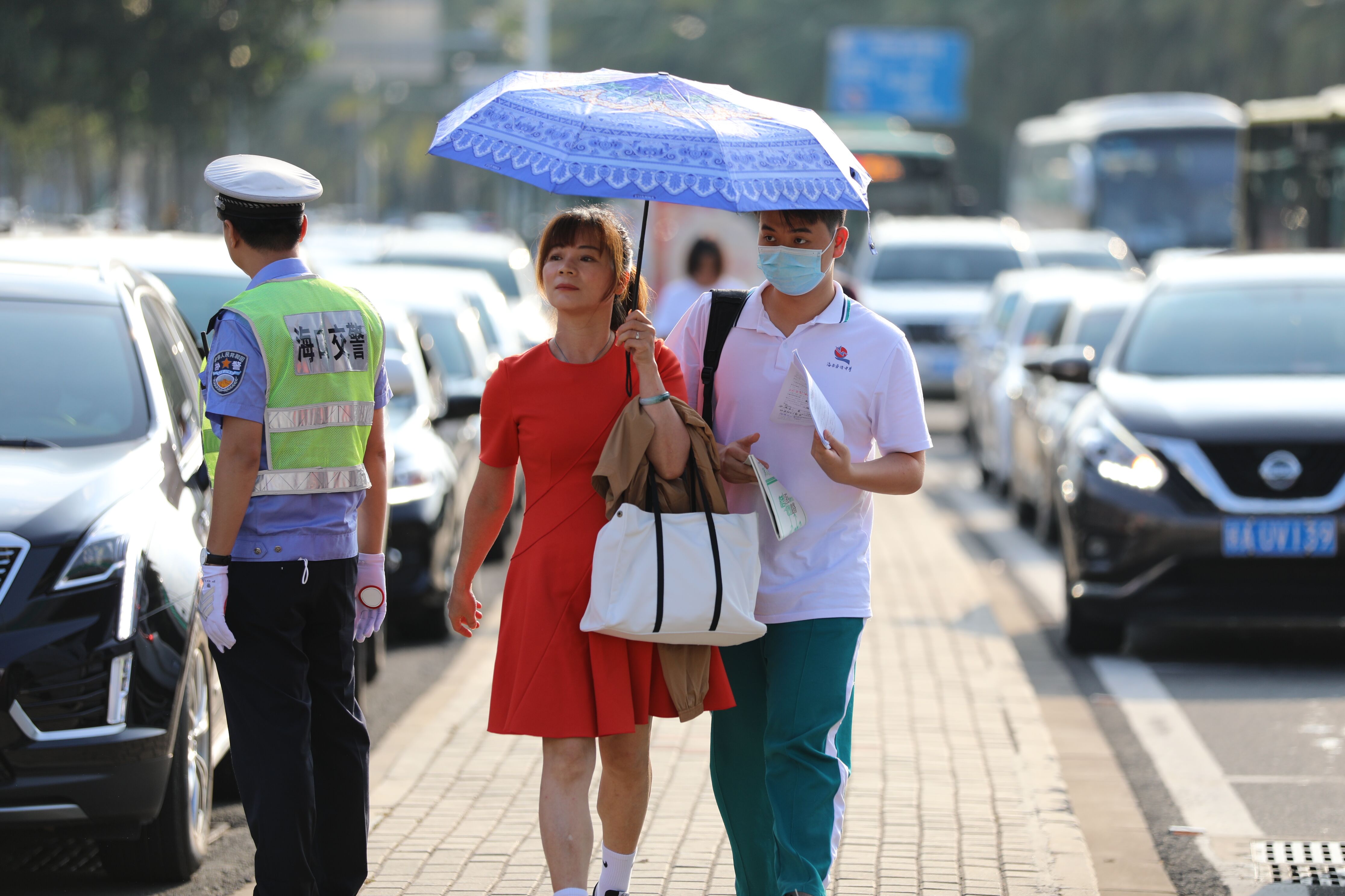 海南華僑中學考點,家長身著紅色衣服送考生。人民網 孟凡盛攝