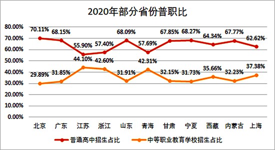 記者翻看了2020年各省《國民經濟和社會發展統計公報》發現,2020年北京市的普通高中招生占比也是70%,而江蘇省普通高中招生占比也達到了56%,而其他地區招生普職比大多在7∶3與5.6∶4.4之間。