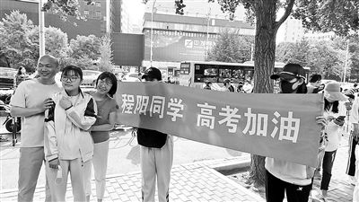 每年考場門口送考團的加油鼓勵,都能給考生們帶來不少動力與能量,也時有感人的情境發生。昨天上午,兩位高一女生拉橫幅為高三學姐加油的一幕,格外引人注目——展開的紅色橫幅上寫著“程陽同學,高考加油”。