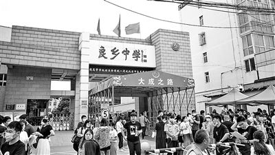 昨日上午7時30分許,在房山良鄉中學門口,考生已陸續到場,北京青年報記者在現場看到,考生經過的測溫棚那段路上鋪著紅毯,在測溫棚的入口處還有“大成之路”四個字,而另一側就是“金榜題名”。每當考生經過時,都有滿滿的儀式感。