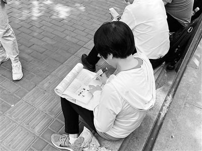 昨日上午10點半,距離語文科目考試結束還有一個小時,北京青年報記者在人大附中考點校門口看到,不少在外等候的家長排排坐在校門口的小石階上休息,其中一位正翻著試卷“做題”的媽媽,吸引了北青報記者的注意。