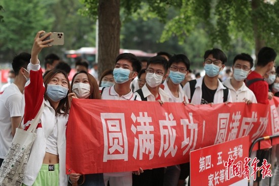 據了解,新冠肺炎疫情防控仍是高考組織工作的重點。在嚴格的防控措施下,今年的高考仍然不乏溫情與熱情。家長老師們期盼和鼓勵的眼神,志愿送考的同學精心準備的橫幅與激勵人心的加油聲,陪伴著考生一起迎接這場人生中重要的挑戰。實習生 李鐵林/攝
