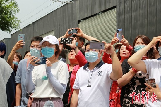 6月7日上午,北京市東城區,北京市第一七一中學考點外,拿著手機準備記錄考生走出考場畫面的家長們。當日,2021年普通高等學校招生統一考試大幕正式拉開,送考的家長有的身穿紅衣,有的拿著手機記錄考生走出考場的畫面,成為各大考點外的一道風景線。中青報·中青網記者 曲俊燕/攝