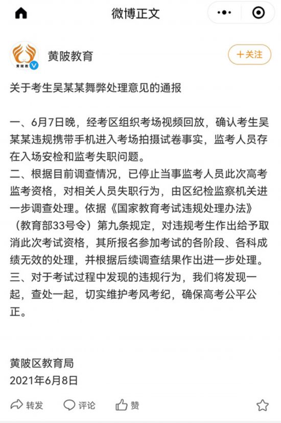 武漢市黃陂區教育局官方微博同日發布《關于考生吳某某舞弊處理意見的通報》。已經連夜處理該事件,已對涉事學生的作弊行為進行了認定,學生也已經承認了自己的作弊行為。