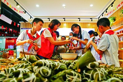 6月10日,江蘇省宿遷市泗洪縣紀檢監察系統黨員志愿者與城區健康路小學的留守兒童會聚一堂,與孩子們一起包粽子迎端午。許昌亮攝/光明圖片