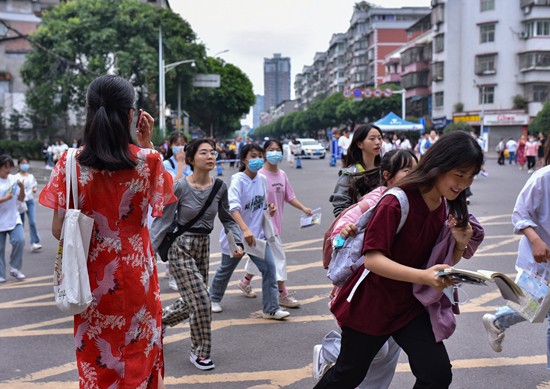 6月7日上午,高考考點門口,學生們準備進考場,一名老師身穿紅色旗袍送考。