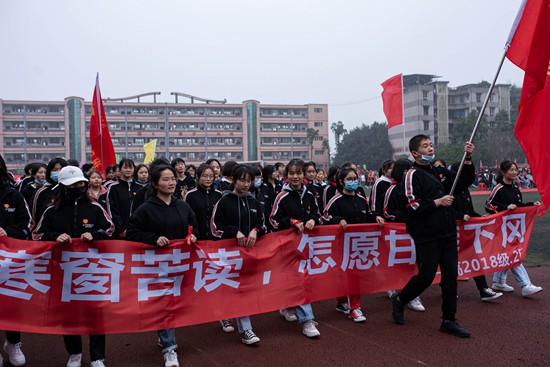 3月9日,高考誓師大會現場,我們班的學生舉著橫幅和班旗,列隊準備走過主席臺。橫幅上寫著“同是寒窗苦讀,怎愿甘拜下風”。