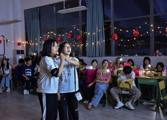 6月8日晚,高考結束后,班上組織了聯歡晚會,同學們在一起唱歌。
