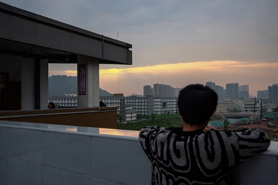 4月8日傍晚,天際出現了一道晚霞,我的一名學生在走廊里向遠處看去。