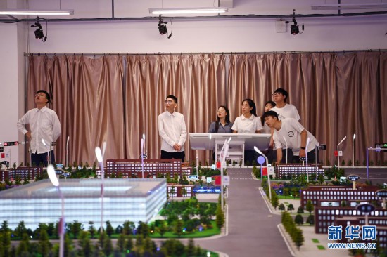 天津大學智能與計算學部的學生在沙盤教室內調試設備(6月16日攝)。