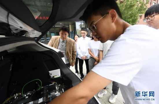 天津大學智能與計算學部教師翁仲銘(左一)在和學生一起調試自動駕駛車輛數據(6月16日攝)。
