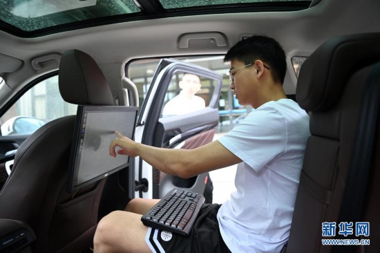 天津大學智能與計算學部的學生在調試自動駕駛車輛的數據(6月16日攝)。