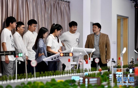 天津大學智能與計算學部教師翁仲銘(右一)在沙盤教室內給學生講授智能駕駛等方面的內容(6月16日攝)。
