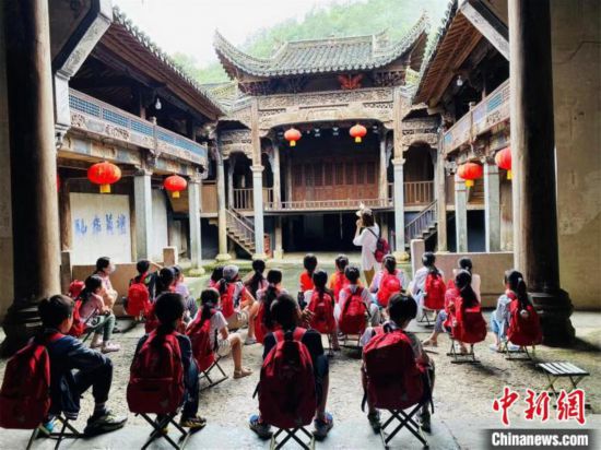 圖為孩子們在一處歷史建筑前接受革命傳統文化教育!±蠲髅 攝