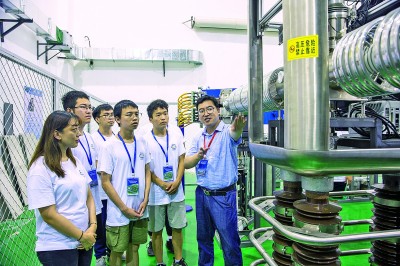 7月13日,中國原子能科學研究院2021年度優秀大學生夏令營在江西省瑞昌市開營,來自清華大學、四川大學、蘭州大學的30多名大學生走進中國原子能科學研究院瑞昌核物理應用研究院,近距離與“核”接觸。在為期4天的活動中,大學生們將參加核數據技術、加速器及其應用、輻射效應等專題學術交流。開辦此次夏令營的目的是吸引優秀大學生投身國家物理核技術行業,為我國核事業的發展作貢獻。圖為大學生們在中國原子能科學研究院瑞昌核物理應用研究院參觀電子加速器輻照中心。(魏東升)