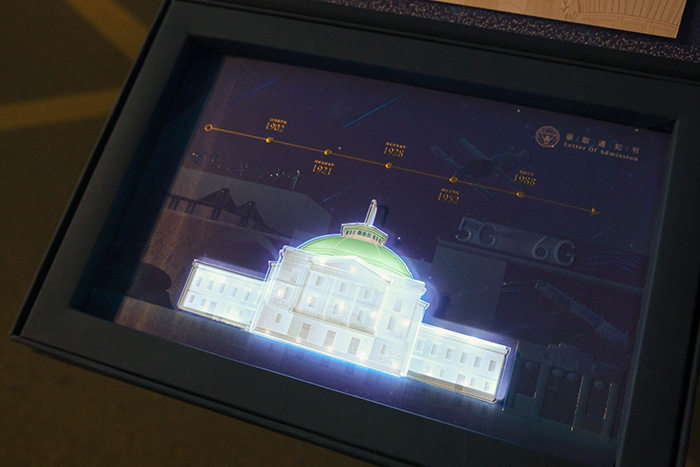 大禮堂用高透光材質覆蓋,層次分明,細節豐富,立體感十足。打開通知書禮盒,校歌響起的同時,大禮堂也被點亮。