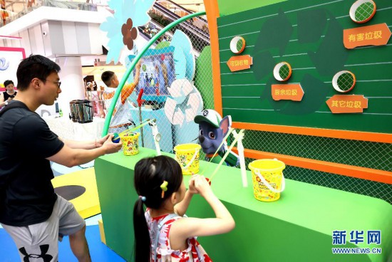 7月16日,小朋友在家人的陪伴下體驗垃圾分類游戲。