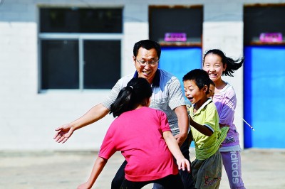 山西省柳林縣高家溝鄉中心校楊家洼小學教師王福平帶著學生們在學校院子里玩游戲。新華社發