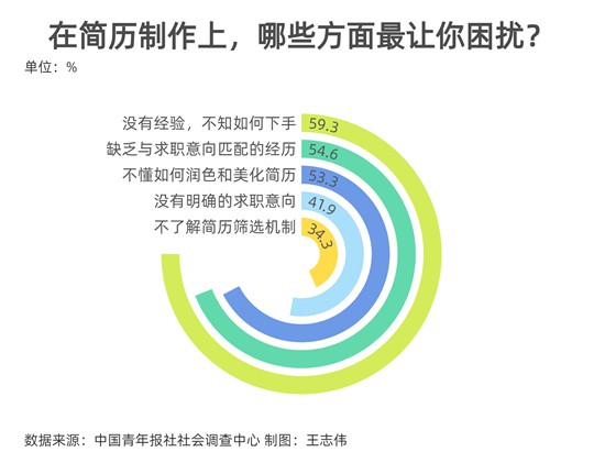 簡歷是求職的敲門磚,在簡歷制作上,有多少人存在困擾?日前,中國青年報社社會調查中心聯合問卷網(wenjuan.com),對1534名受訪者進行的一項調查顯示,71.2%受訪者在簡歷制作上存在困擾。沒有經驗、不知如何下手(59.3%)和缺乏與求職意向匹配的經歷(54.6%)等最讓受訪者困擾。在簡歷制作上,93.0%受訪大學生表示需要支持。76.5%受訪者希望請求職成功的前輩分享經驗。