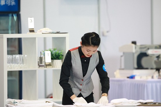 餐具擺放需要間隔相等、餐巾折疊需要完全一致、4個客人4杯水齊平、操作時任何材料不可以掉出容器之外……賽前機械地重復這些的項目,并且細抓每一個打分點,過程枯燥,對于陳延的耐心是一個考驗,而更讓她為難的是用英語和客人交流。