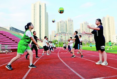 暑假來臨,四川省華鎣市在部分學校試點開辦體育托管班,開設排球、籃球、足球、羽毛球等體育項目免費培訓,讓中小學生在體育鍛煉中享受樂趣、增強體質,豐富他們的暑假生活。圖為7月22日,參加暑期校園體育托管班的學生在雙河第二中學練習排球墊球技術。(周松林攝)