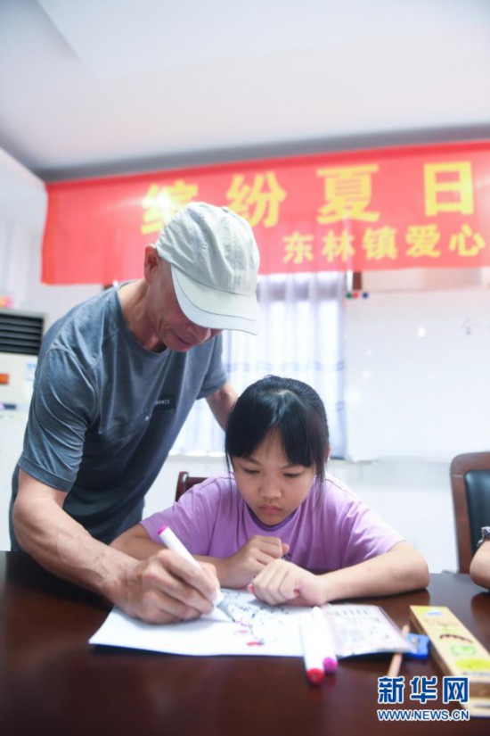 7月29日,在位于東林鎮的浙江金甲飼料有限公司內,員工子女在志愿者老師的帶領下參加繪畫興趣活動。新華社記者 徐昱 攝