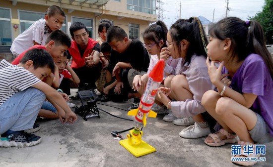 7月28日,在陜西銅川王家砭村“復興少年宮”的科創課上,志愿者為孩子們講解“水火箭”的原理。