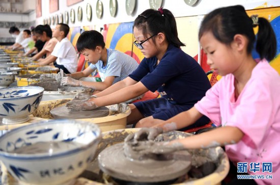 7月28日,孩子們在陜西銅川王家砭村“復興少年宮”的陶吧里制作陶器。