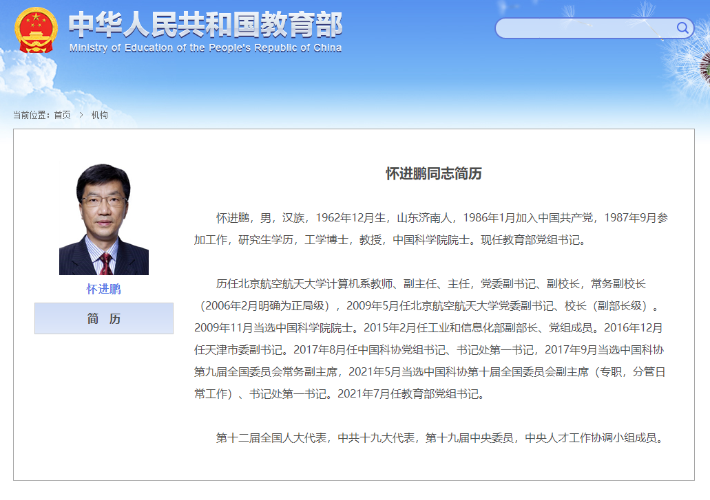 人民網北京8月2日電 今天,教育部官網“教育部領導”欄目顯示,懷進鵬已任教育部黨組書記。