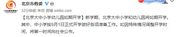 人民網北京8月16日電 今天上午,北京市教委通過官方微博發布消息稱,新學期,北京大中小學和幼兒園將如期開學。其中,中小學按9月1日正式開學做好各項準備工作。如因特殊情況調整開學時間,將第一時間向社會公布。