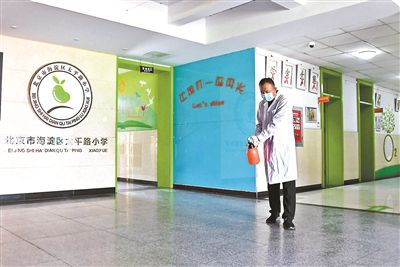 8月26日,在北京市海淀區太平路小學,工作人員對教學樓樓道進行消毒 供圖/新華社