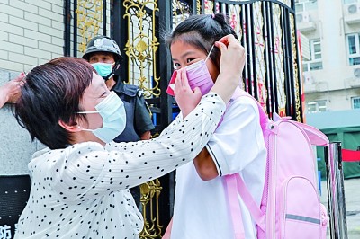 八月三十一日,北京小學廣外分校的老師在校門口為忘記戴口罩的學生佩戴、整理口罩。新華社記者 張玉薇攝