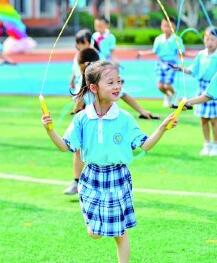 湖南長沙市天心區仰天湖桂花坪小學二年級的學生在體育課上跳繩。新華社發