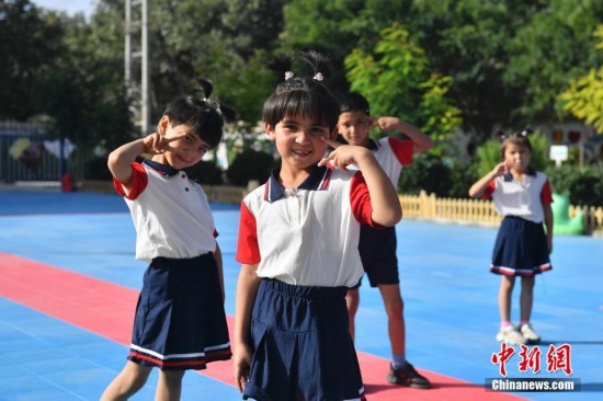 9月27日,新疆和田縣布扎克鄉庫木村幼兒園,小朋友在嬉戲玩耍。當日,據該幼兒園園長維吾爾族姑娘阿爾孜古麗·阿力木介紹,該園由北京市援建,可容納300名學生,目前有14名教師。 中新社記者 李雪峰/文 中新社記者 田雨昊/攝