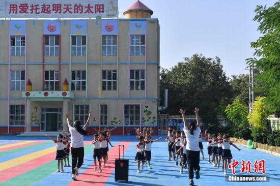9月27日,新疆和田縣布扎克鄉庫木村幼兒園,小朋友在跟隨老師跳操。當日,據該幼兒園園長維吾爾族姑娘阿爾孜古麗·阿力木介紹,該園由北京市援建,可容納300名學生,目前有14名教師。 中新社記者 李雪峰/文 中新社記者 田雨昊/攝