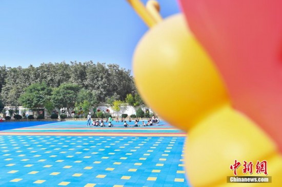 9月27日,新疆和田縣布扎克鄉庫木村幼兒園,小朋友和老師一起在做游戲。當日,據該幼兒園園長維吾爾族姑娘阿爾孜古麗·阿力木介紹,該園由北京市援建,可容納300名學生,目前有14名教師。 中新社記者 李雪峰/文 中新社記者 田雨昊/攝