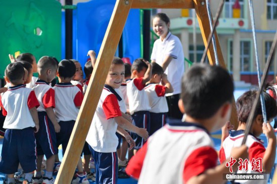 9月27日,新疆和田縣布扎克鄉庫木村幼兒園,小朋友在嬉戲玩耍。當日,據該幼兒園園長維吾爾族姑娘阿爾孜古麗·阿力木介紹,該園由北京市援建,可容納300名學生,目前有14名教師。 中新社記者 李雪峰/文 中新社記者 田雨昊/攝