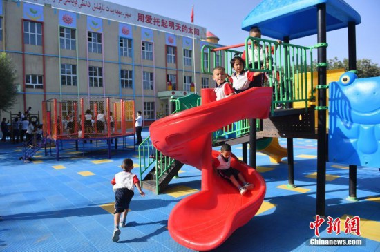 9月27日,新疆和田縣布扎克鄉庫木村幼兒園,小朋友在玩滑梯。當日,據該幼兒園園長維吾爾族姑娘阿爾孜古麗·阿力木介紹,該園由北京市援建,可容納300名學生,目前有14名教師。 中新社記者 李雪峰/文 中新社記者 田雨昊/攝