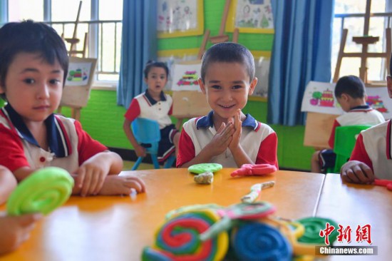 9月27日,新疆和田縣布扎克鄉庫木村幼兒園,小朋友在上手工課。當日,據該幼兒園園長維吾爾族姑娘阿爾孜古麗·阿力木介紹,該園由北京市援建,可容納300名學生,目前有14名教師。 中新社記者 李雪峰/文 中新社記者 田雨昊/攝
