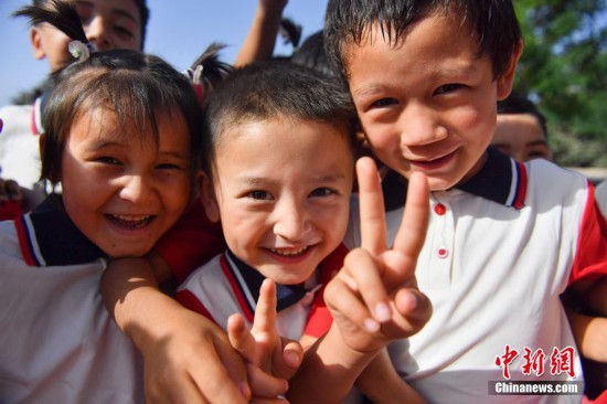 9月27日,新疆和田縣布扎克鄉庫木村幼兒園,小朋友在嬉戲玩耍。當日,據該幼兒園園長維吾爾族姑娘阿爾孜古麗·阿力木介紹,該園由北京市援建,可容納300名學生,目前有14名教師。 中新社記者 李雪峰/文 中新社記者 田雨昊/攝